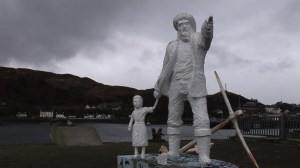 Someone suddenly and unexpectedly died on Knoydart yesterday. He was a sculptor, a difficult and lonely man. He had a heart attack in the village while helping to move a boat. Me and my sister watched the helicopter come with the paramedics. Later we watched a boat leave with his body. His death was another reminder of the randomness of life, of its frailty and the question of what you choose to leave behind. Mark made lots of enemies but he also left behind sculptures that strangers will enjoy. A fisherman holding a small child’s hand on Mallaig pier.